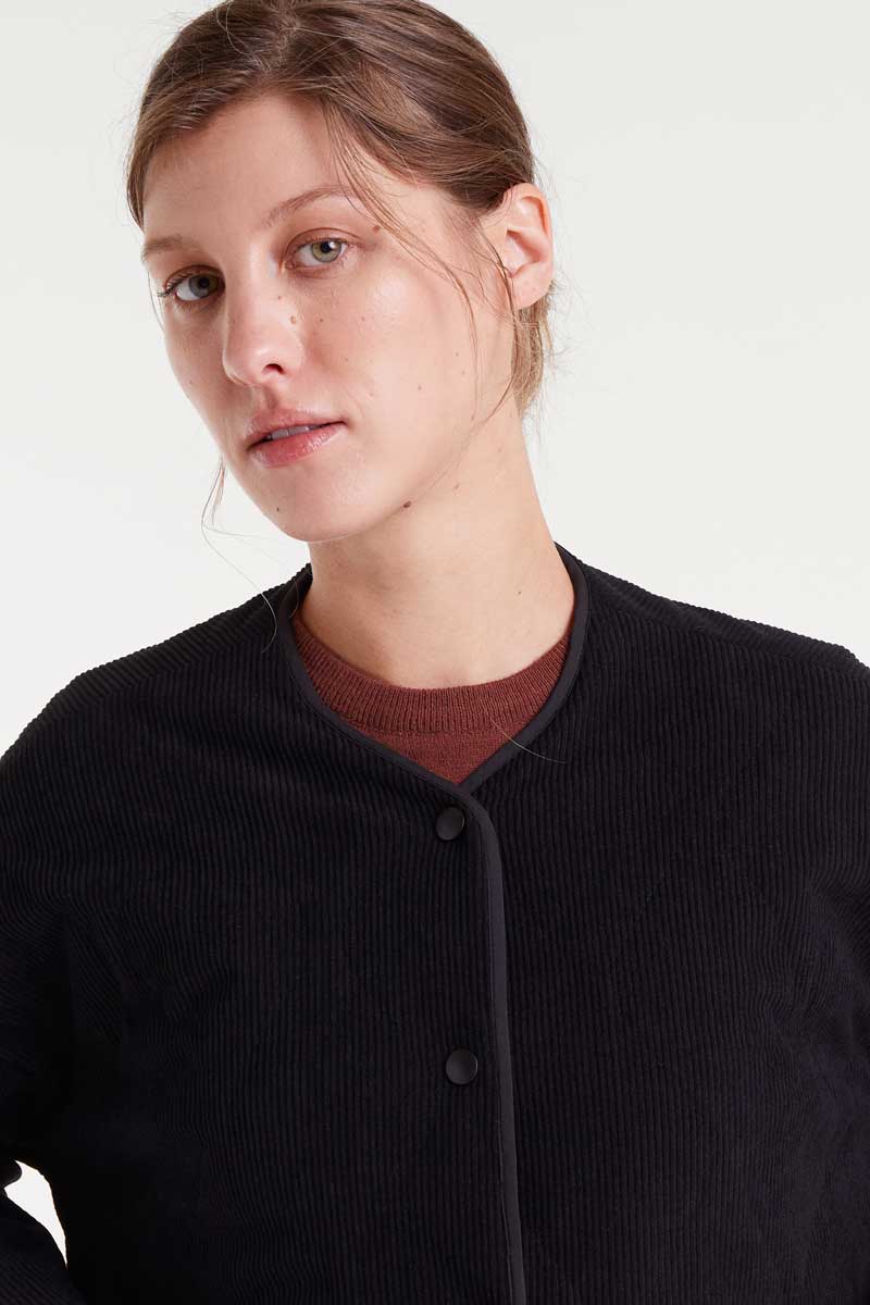 Black padded corduroy jacket. V-neck with long sleeves. Snap-button front closure. Side pockets. Slightly dropped shoulders. This jacket is true to size. The model is 177 cm tall and is wearing a size S.