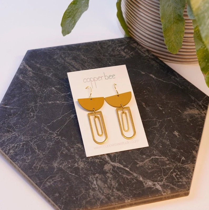 Geometric brass and gold plated shapes are combined with coloured semi-circles to create a statement pair of earrings.