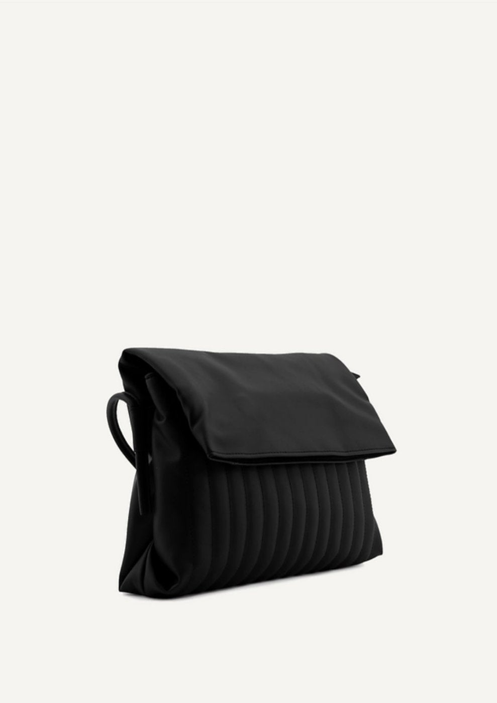 A black shoulder bag with a flap. Made of high quality padded vegan leather, with black YKK zipper and a linen lining. This bag has two compartments. Front compartment with a zipper and back compartment which you can reach trough the flap. In the inside of the back compartment you find an extra pocket to store some small items.