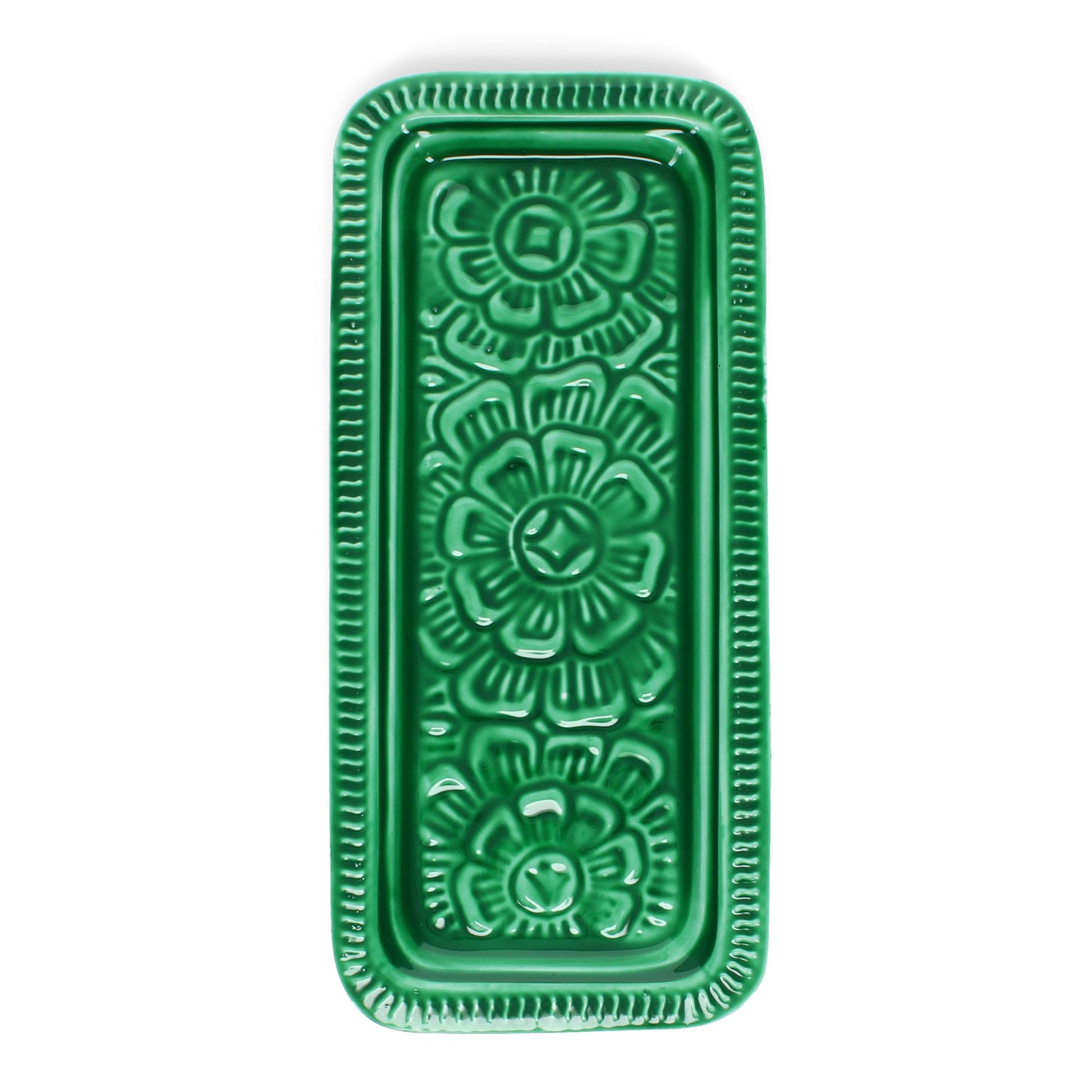 Decorative cast metal tray with dark green enamel finish. Rectangular in shape, with pretty floral pattern in the centre and line pattern around the edges. The perfect accessory for home décor, that can be used to display a wide array of items: candles, tealights, reed diffusers, small potted plants, or flowers in small vases, to name a few.