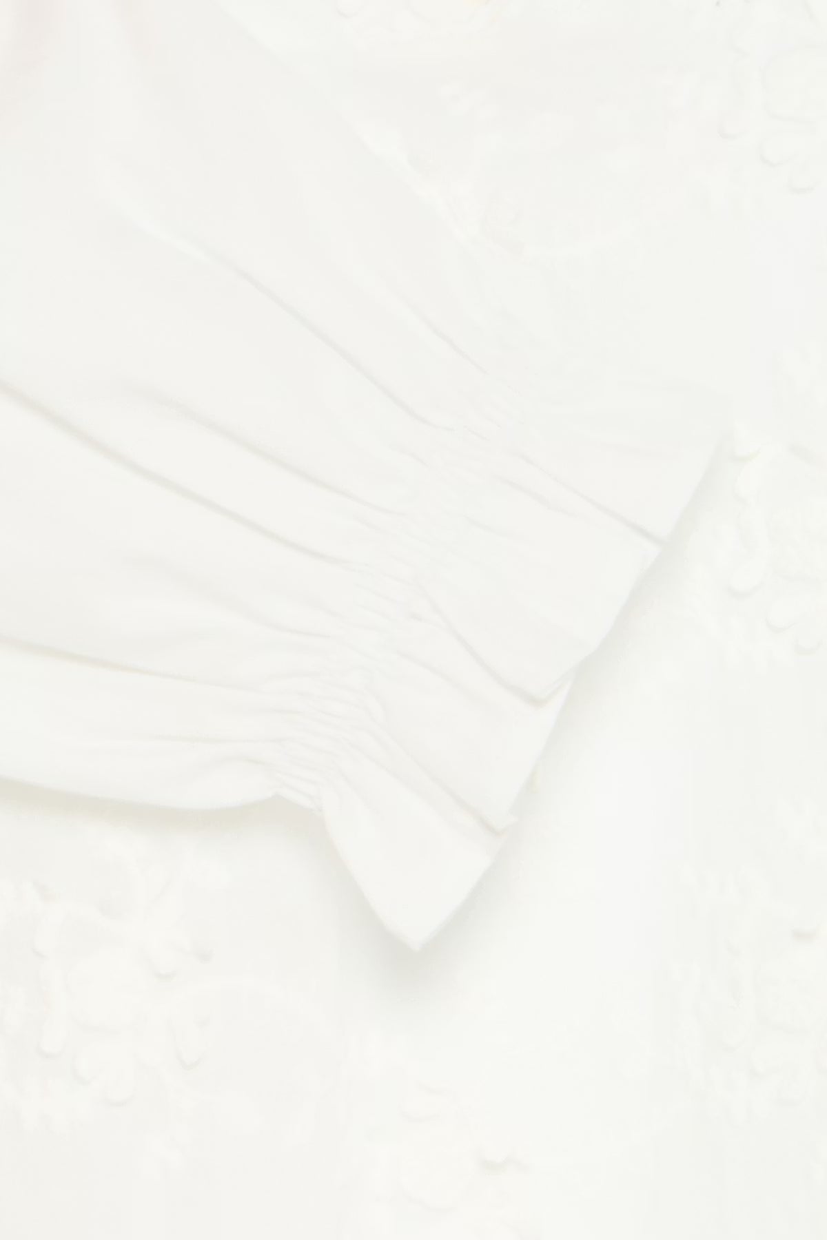 This straight-cut blouse features a V-notch neckline, three-quarter sleeves with elastic cuffs and subtle ruffle edges, and a lightly textured front. Minimalist details create an effortlessly cool silhouette.