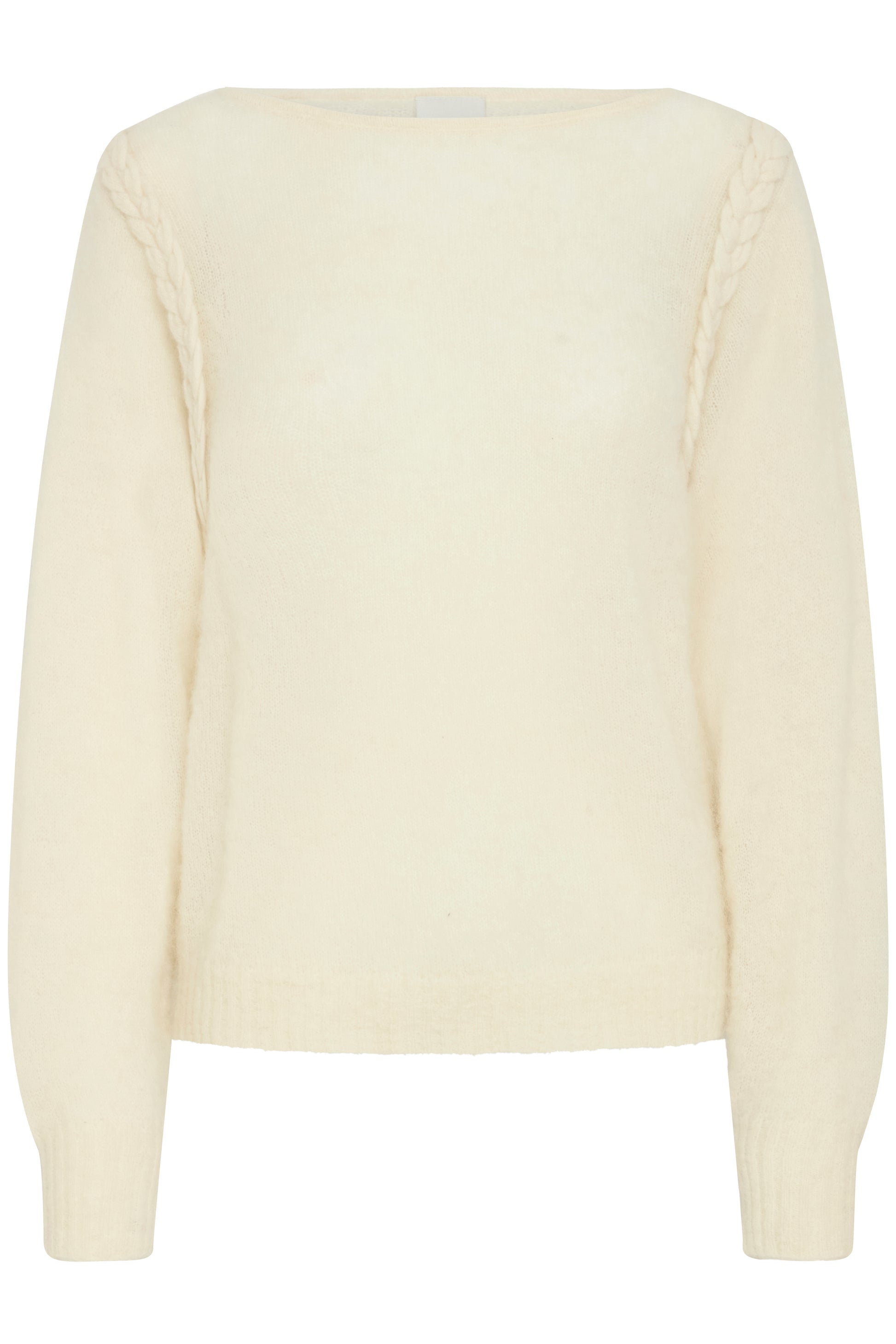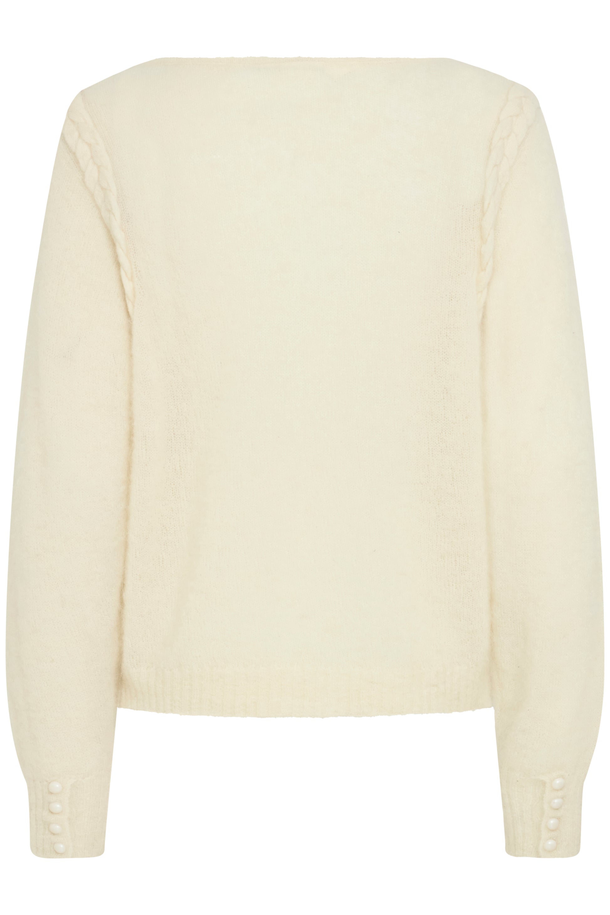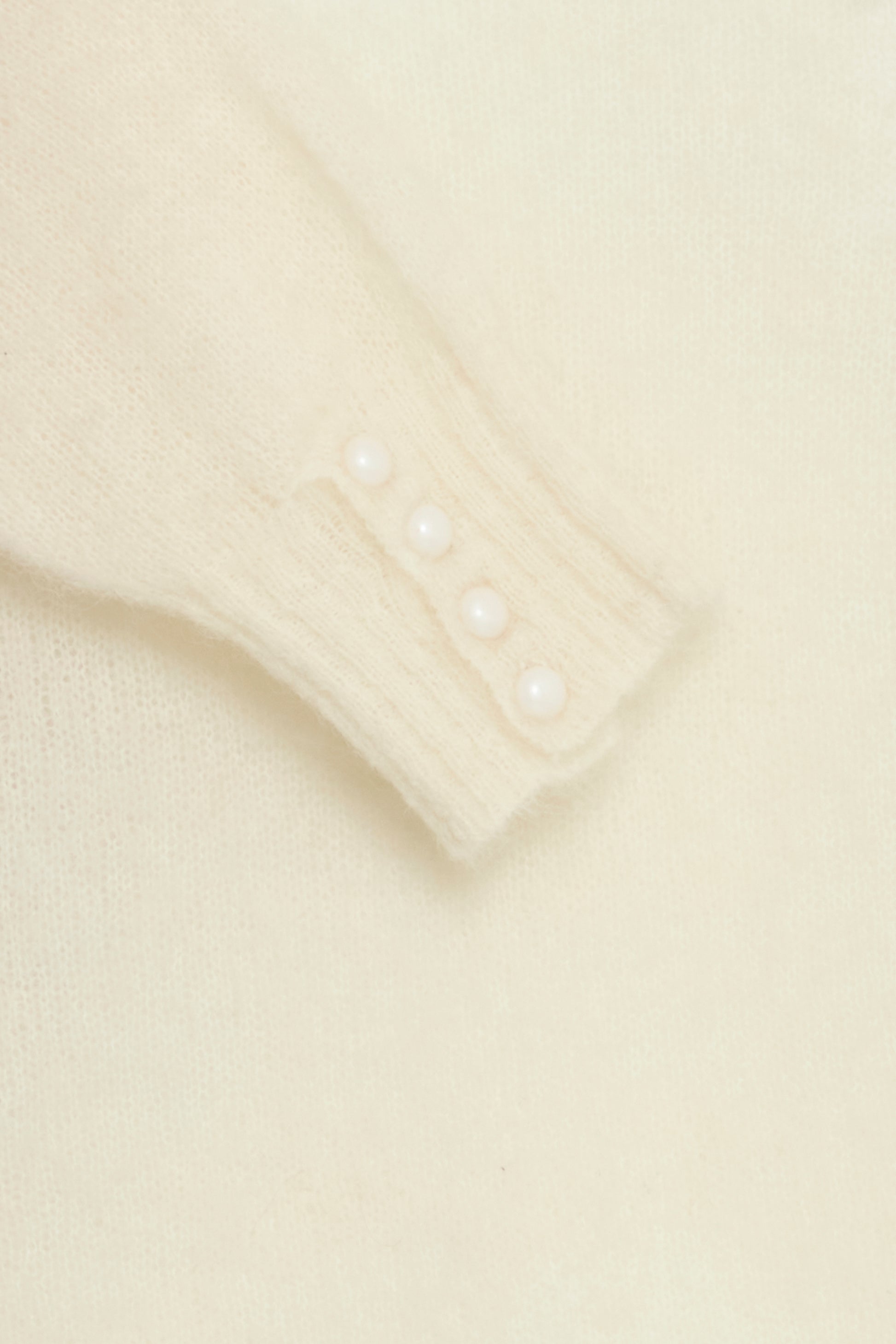 A knitted jumper featuring a braided detail along the shoulder seam and button accents on the cuffs.