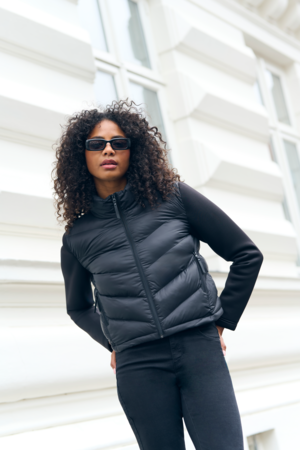 This puffer-style jacket is the perfect transitional piece for spring - with a stretchy fabric sleeve and a puffer body, it's both functional and fashionable.