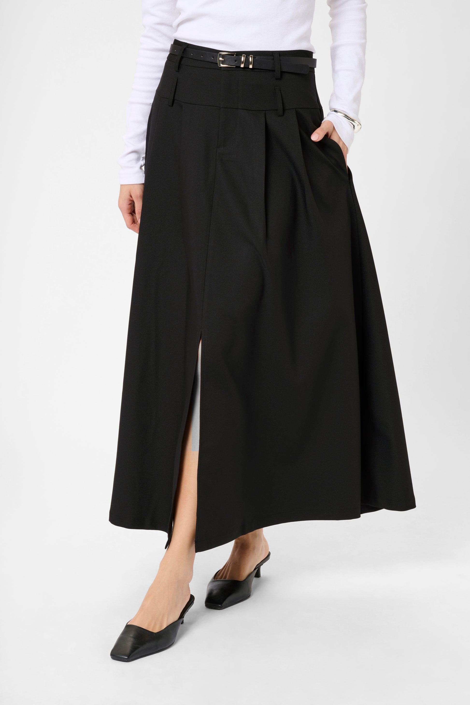 This long black A-line skirt features a full-length silhouette with soft drape, subtle front slit, structured waistband, belt loops, and a sleek buckle belt for a refined finish.