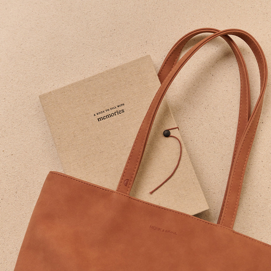 – material inside • linenWe aim to reduce our footprint in this beautiful world. We made the next step and made this Monk & Anna tote bag of recycled vegan leather. It’s no longer wrapped in plastic, but protected by a semi-transparent dust bag – which can be used again to store the bag when you’re not wearing it. Enjoy!