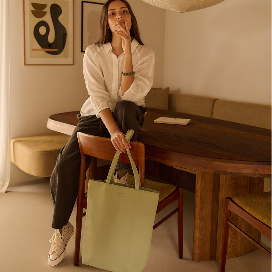 – material inside • linenWe aim to reduce our footprint in this beautiful world. We made the next step and made this Monk & Anna tote bag of recycled vegan leather. It’s no longer wrapped in plastic, but protected by a semi-transparent dust bag – which can be used again to store the bag when you’re not wearing it. Enjoy!