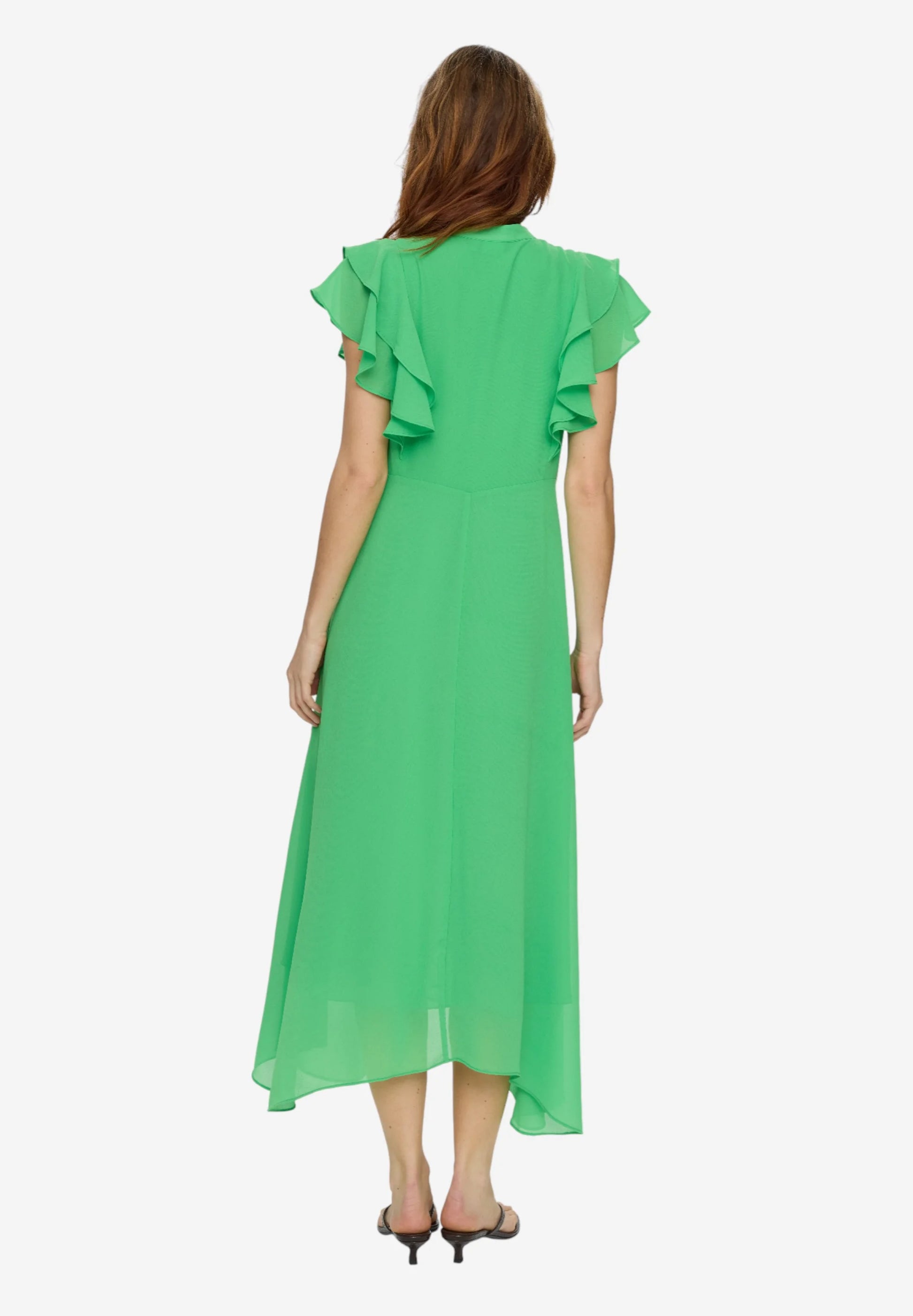 Numph Nuparisa Ruffle Sleeve Midi Dress is cut in a fluid midi length with a softly defined waist and a buttoned high neckline. The layered ruffle sleeves add movement through the shoulder, while the skirt falls into an easy drape with a subtle dipped hem that creates shape as you walk. A striking green shade makes it a confident choice for summer events or occasion dressing.