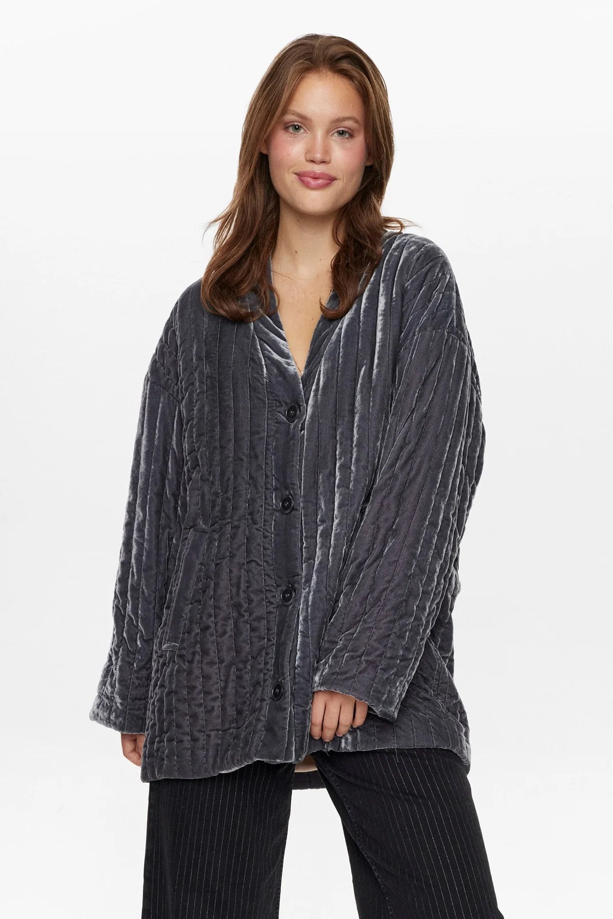 - This Nutella Blazer Jacket features a mid-length, button-through design in a stunning grey/silver velvet material. With its versatile style, it is perfect for both evening and daytime wear.