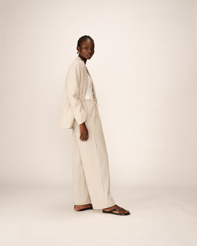 The PIA suit jacket is an iconic piece from the collection. This PIA tailored blazer features a relaxed cut and a striped fabric that combines elegance with modernity. The model has long sleeves, a notched collar, and a V-neckline that create a sophisticated silhouette. This blazer is made from natural fiber fabric and joins our 'Un Brin de Vert' range.