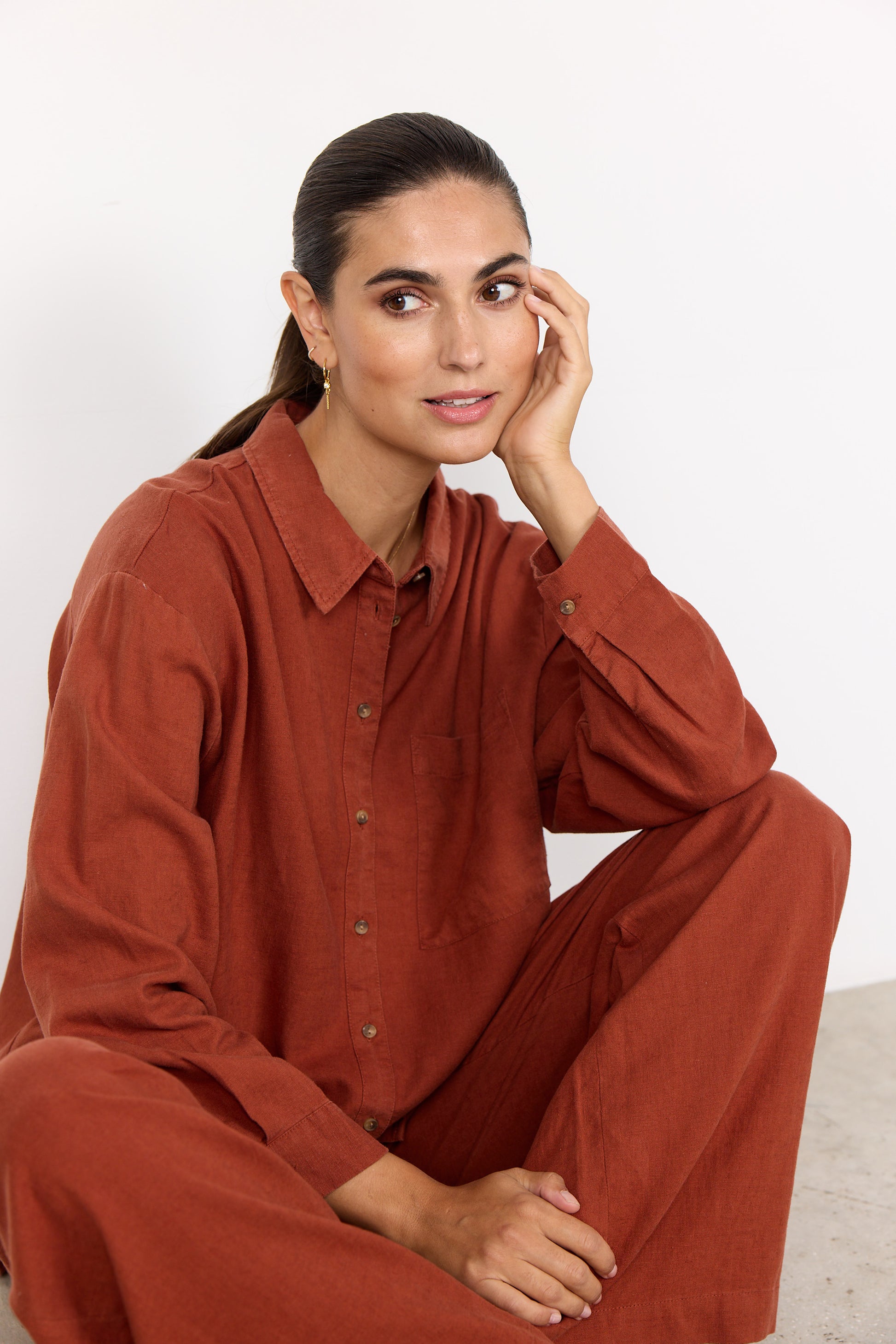Description EN: The SC-Ina 53 Shirt combines timeless style with casual comfort, crafted from a soft linen and viscose blend. Featuring a traditional collar, button placket, long cuffed sleeves, and a chest pocket, its relaxed fit ensures effortless wear. Pair this elegant shirt with a flowing satin skirt and ballet flats for a refined, classic outfit that stands out.