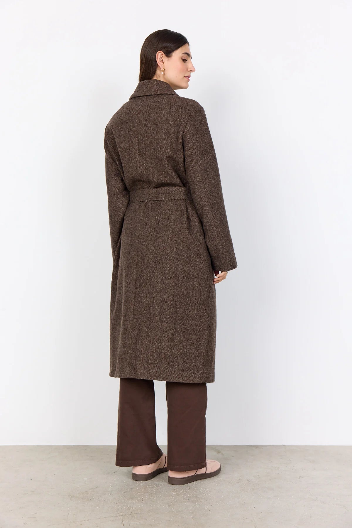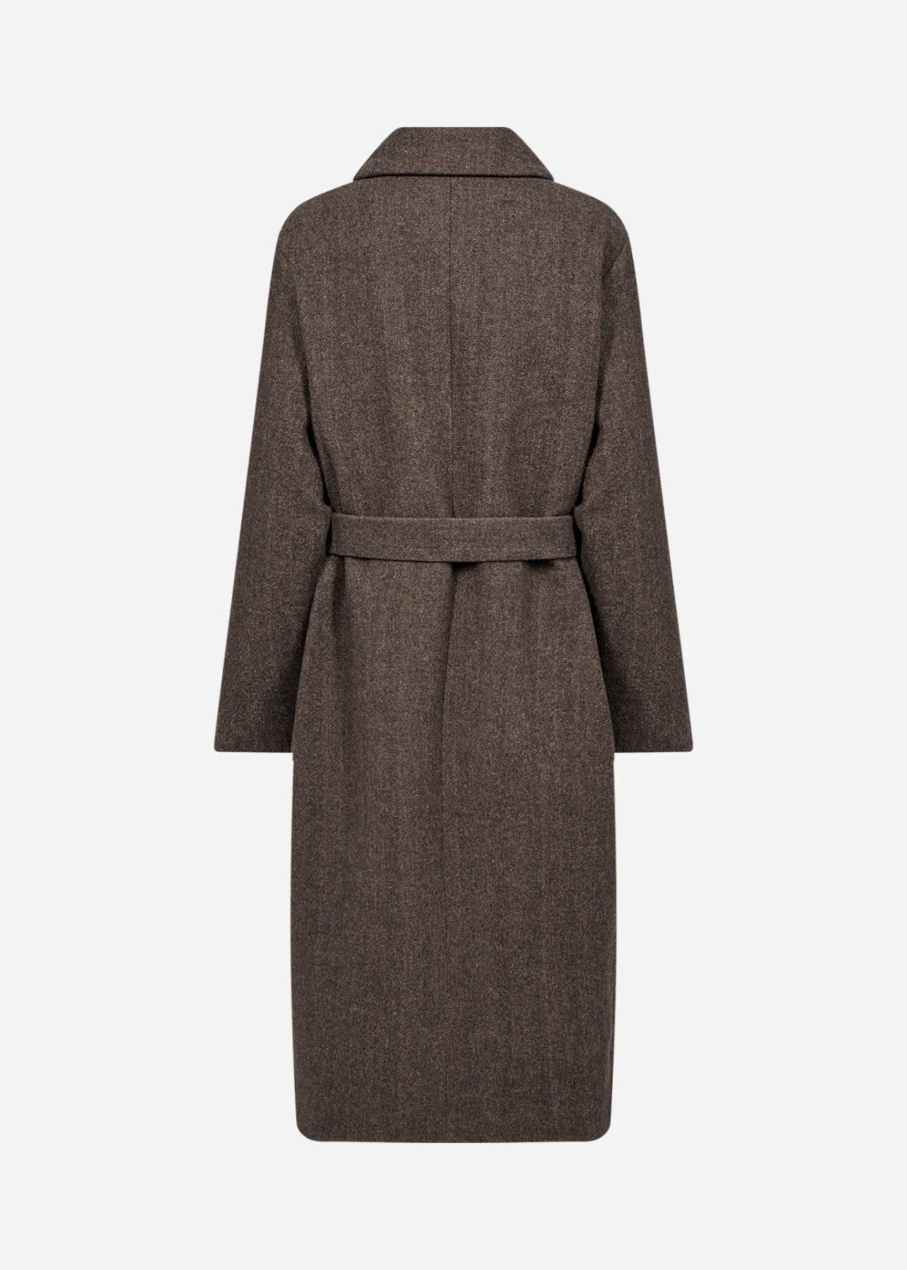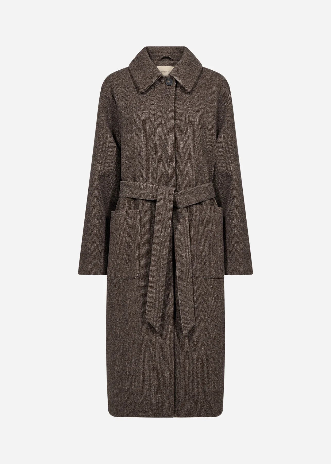 The SC-SHAKIRA 2 coat blends 60% polyester, 32% wool, and 8% acrylic for a sleek, textured finish. It features a classic collar, a single button fastener, roomy front pockets, and a waist belt, all in a herringbone pattern with a knee-length silhouette. Style it with tailored trousers and ankle boots for a sharp, sophisticated vibe.